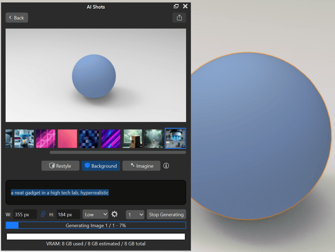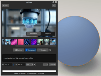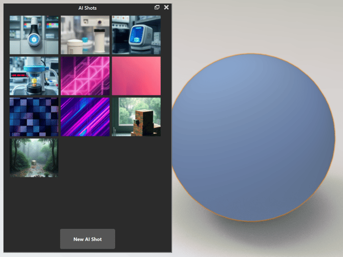 AI Shots is a new feature to mood-board new ideas, add a background which will consider the on screen geometry and affect its reflections or to restyle an existing scene.