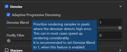 A new feature that is only available in GPU Mode on Nvidia Graphics cards is the Adaptive Progressive Denoising. With this enabled, the sampling of the image will take into consideration where remaining noise lies in the scene and calculate more samples only where necessary resulting in overall faster renderings with lower noise.