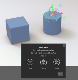 The feature allows users to click on a surface to reposition the pivot point, automatically aligning the gizmo normal to the surface for more intuitive manipulation.